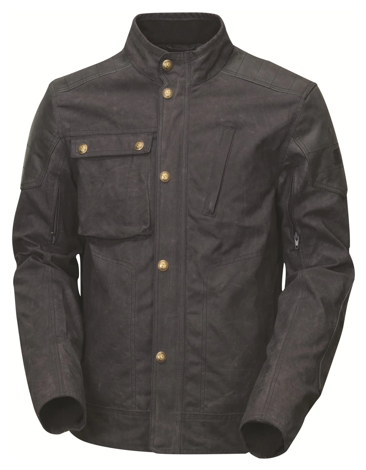 It takes a real man to wear the Roland Sands Truman Jacket. With asymmetrical chest pockets and genuine leather reinforcements in the shoulders and elbows, the RSD Truman Jacket marries bold style and cold-rolled functionality. The water repellent and breathable waxed cotton chassis has ample provisions for ergonomics and stashing your personal effects, including a soft-lined electronics pocket as well as zippered vents on the upper sleeve to enhance the weather versatility of the lightweight textile frame. It was Harry S. Truman himself who said, โNever kick a fresh turd on a hot day.โ True wisdom from a true man.